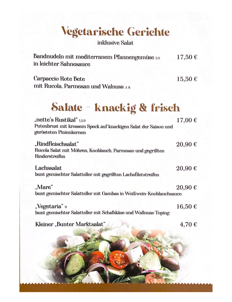 - Salads: The Putenbrust Salad and Beef Salad showcase vibrant ingredients that cater to both meat lovers and health enthusiasts alike.