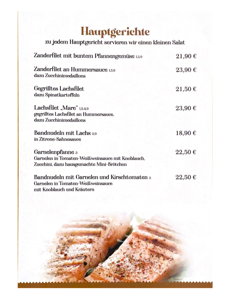 - Main Courses: From the savory Zanderfilet with Hummersauce to the succulent Grilled Salmon with Spinach Potatoes, each dish promises a burst of flavor and freshness, complemented by a refreshing side salad.